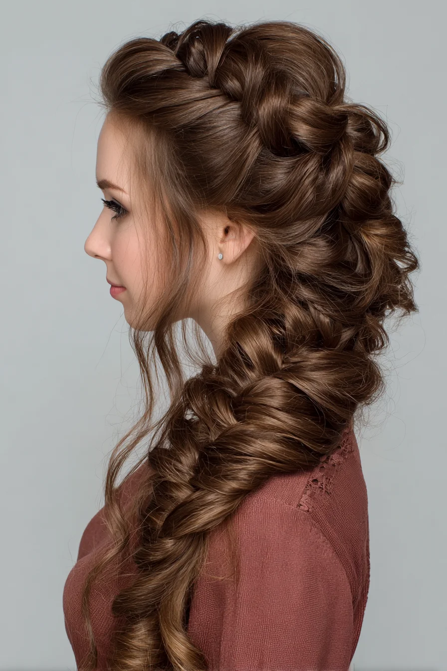 Love this it gives big, romantic volume without looking overdone. It reads like a thick, messy fishtail braid swept to the side with a loose, textured crown. Works for thick or long hair and for anyone who wants a dressed-up but relaxed vibe for weddings or date nights. To do it: tease the crown for lift, mist with texturizer, gather hair to one side and fishtail-braid loosely, then pull sections apart to pancake and build width; secure with clear elastics and hide ends with pins. Youll need bobby pins, clear elastics, texturizing spray, a teasing comb and a curling iron. Quick tip: honestly, pull a few outer strands after pinning so its lived-in and wont look stiff. I find tiny face-framing bits totally finish the look.