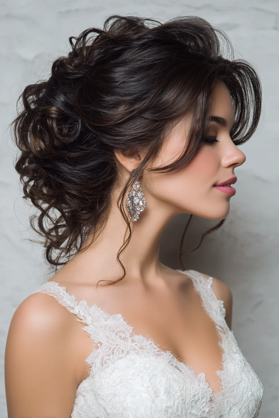 I love this; its romantic and hides that messy day-two texture while still looking polished. Think loose, voluminous curly updo with face-framing tendrils and a sparkly hairpiece. Works great on medium to thick hair and for brides; if youve got thin hair, clip-in extensions basically save the day. Curl first, lightly tease the crown for lift, gather into a mid-to-low messy bun and pin loops and curls where they look natural. Youll need a 1-inch curling iron, lots of bobby pins, a small elastic, texturizing spray or dry shampoo, strong-hold hairspray, and a decorative comb. Quick tip: pin in an X for better hold and dont overbrush, honestly that keeps the texture.
