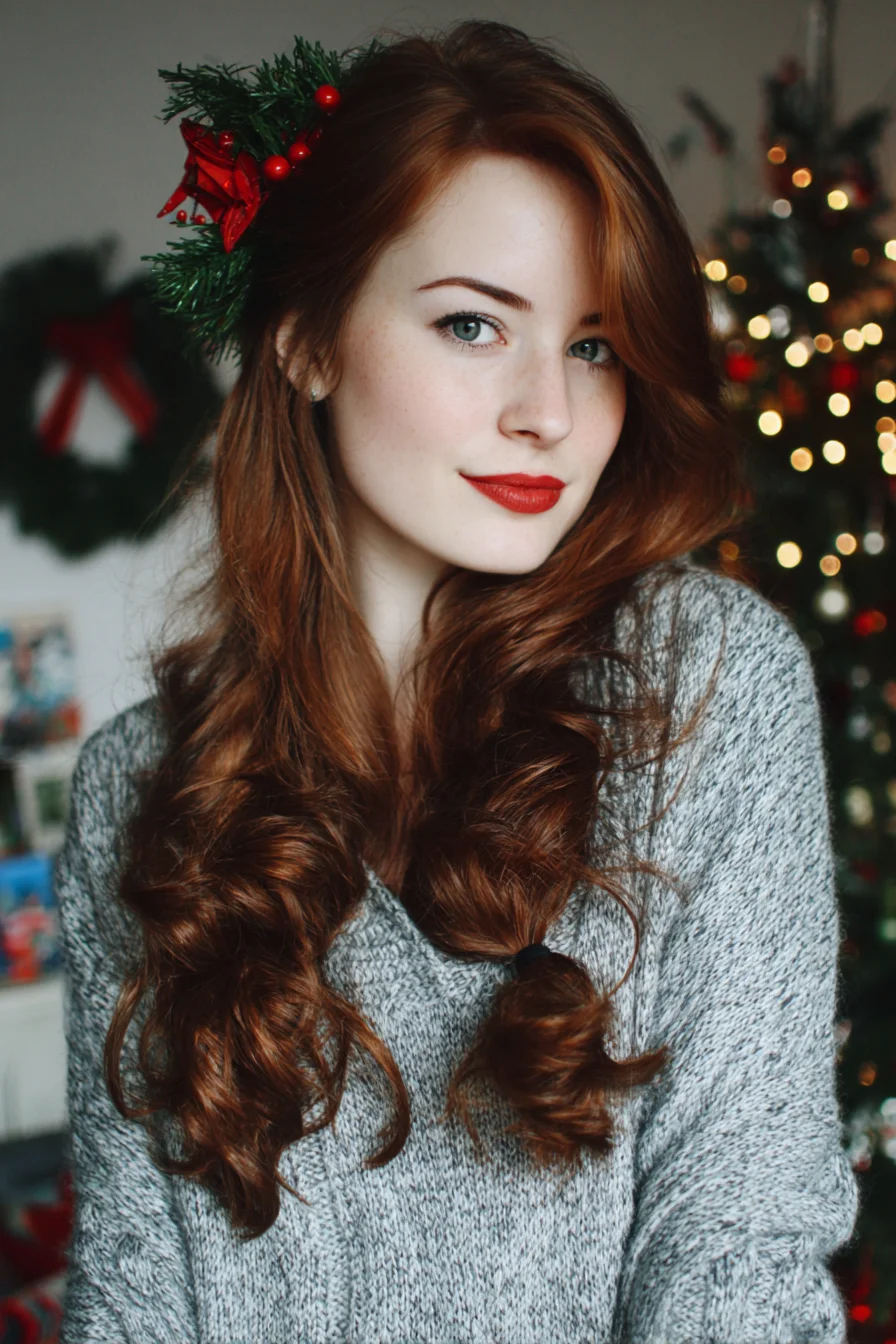 Glamorous retro-inspired voluminous curls swept to the side and pinned with festive foliage create an elegant holiday look. Suitable for medium-to-long hair, this style works best on naturally wavy to straight textures; fine hair benefits from root-lifting products and padding, while thick hair should be sectioned more finely for uniform curls. Start on clean, towel-dried hair: apply heat protectant and a lightweight mousse through mid-lengths, then blow-dry with a round brush for lift at the roots. Create large S-shaped curls with a 1–1½ (25–38 mm) curling iron or heated rollers, alternating directions for a natural bounce. Backcomb lightly at the crown for extra volume, smooth the top layer with a soft brush, and sweep the hair to one side, securing with bobby pins and a decorative sprig. Tools: curling iron or hot rollers, blow-dryer, round brush, tail comb, sectioning clips and bobby pins. Products: heat protectant, mousse or root-lift spray, medium-hold hairspray, light shine serum. Difficulty: moderate (45–60 minutes). Maintenance: sleep on silk, loosely pin curls overnight, refresh with dry shampoo and quick re-curls, and avoid heavy oils at the roots to preserve lift.