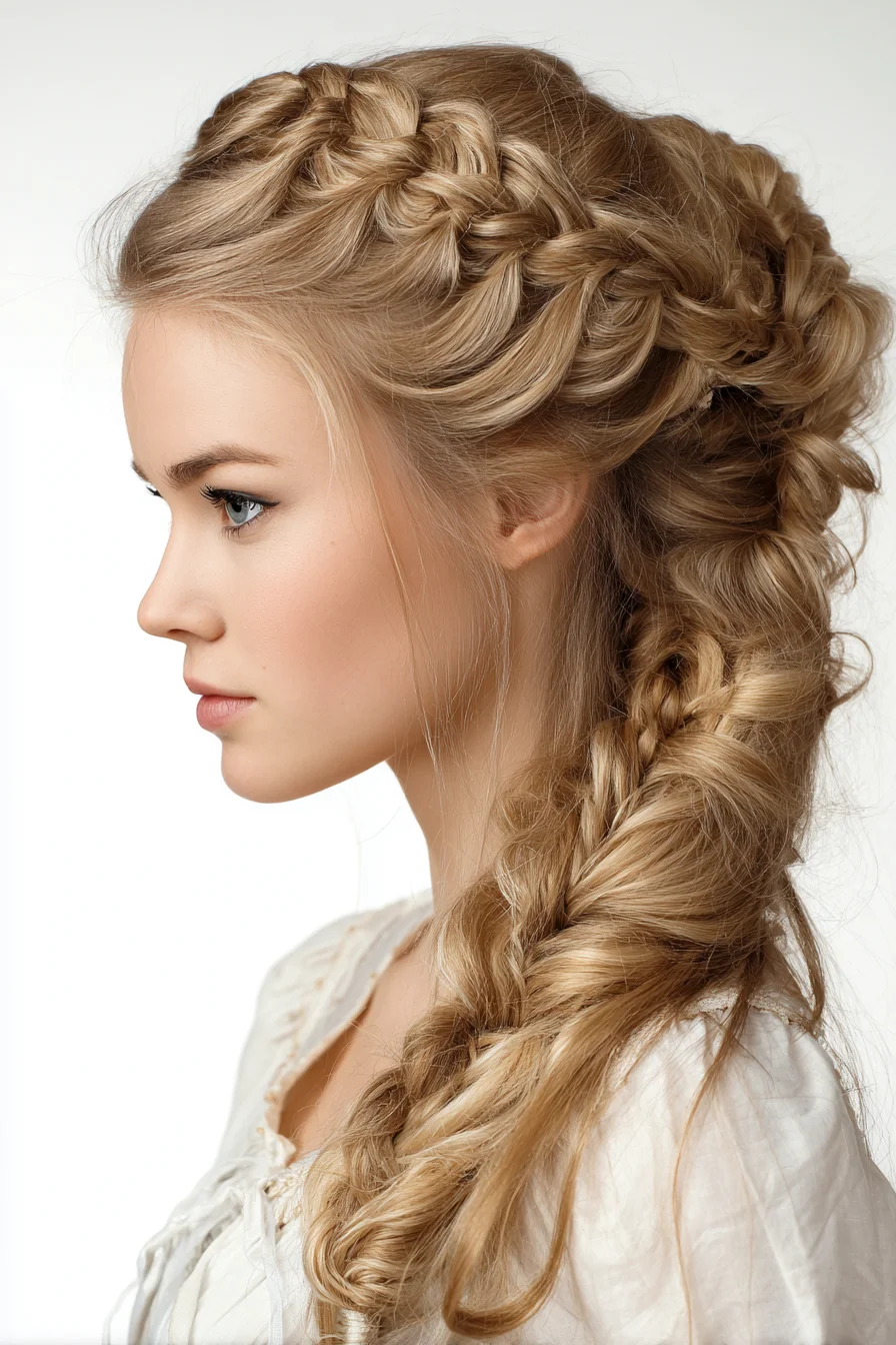 Love this its got that messy, boho-warrior vibe without feeling overdone. A voluminous, textured side braid with small crown braids and loose tendrils. I find it works for thick, wavy or long hair, and honestly great when you want a statement look for weekends or busy mornings that still holds. Start on second-day hair: tease the crown, Dutch-braid a few small top sections, then gather to one side and loosely three-strand braid, finishing with a clear elastic. Youll need bobby pins, a small elastic, dry shampoo or texturizing spray, a teasing comb and hairspray. Quick tip: pretty much pancake the braid and pin at the roots so itll hold all day.